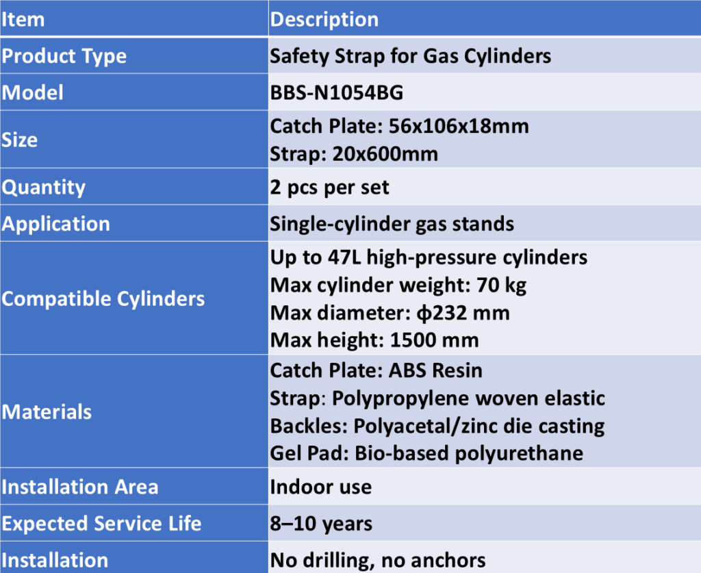 • ・The special belt secures the cylinder to the wall line, reducing rocking and tip‑over motion.