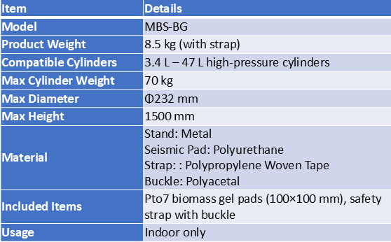 Equipped with Pto7 biomass gel pads (100×100 mm) and a sturdy safety strap with buckle, the MBS‑BG stand adheres securely to indoor flooring, delivering strong resistance to lateral seismic forces.
