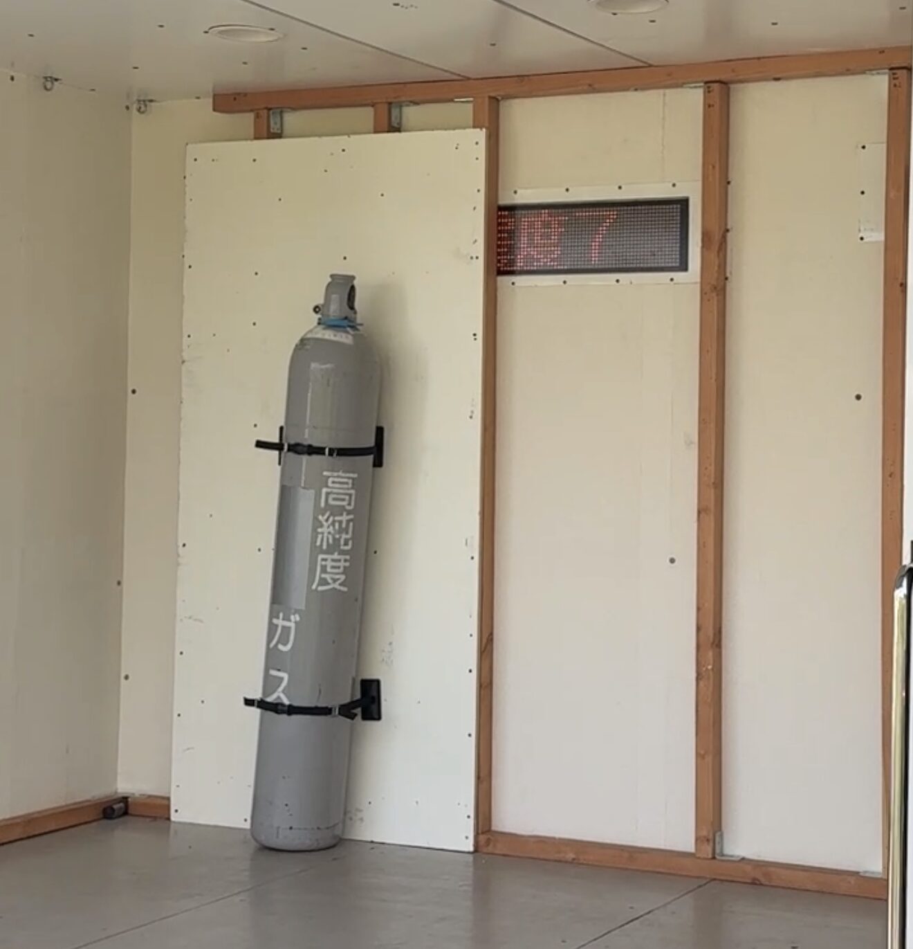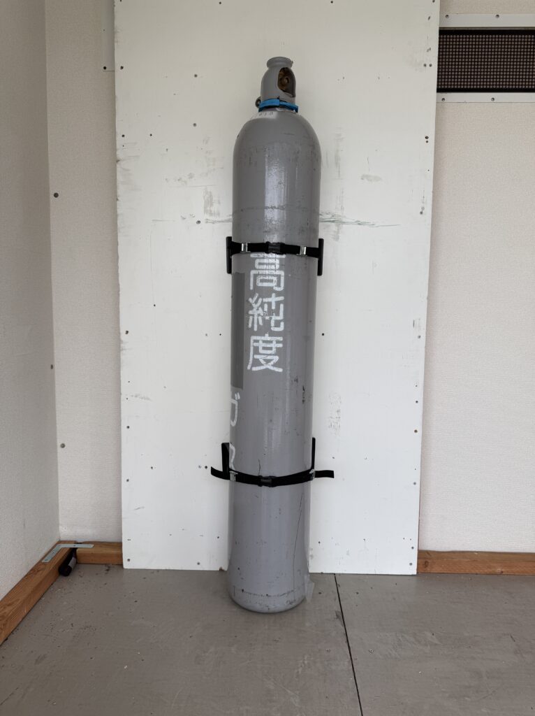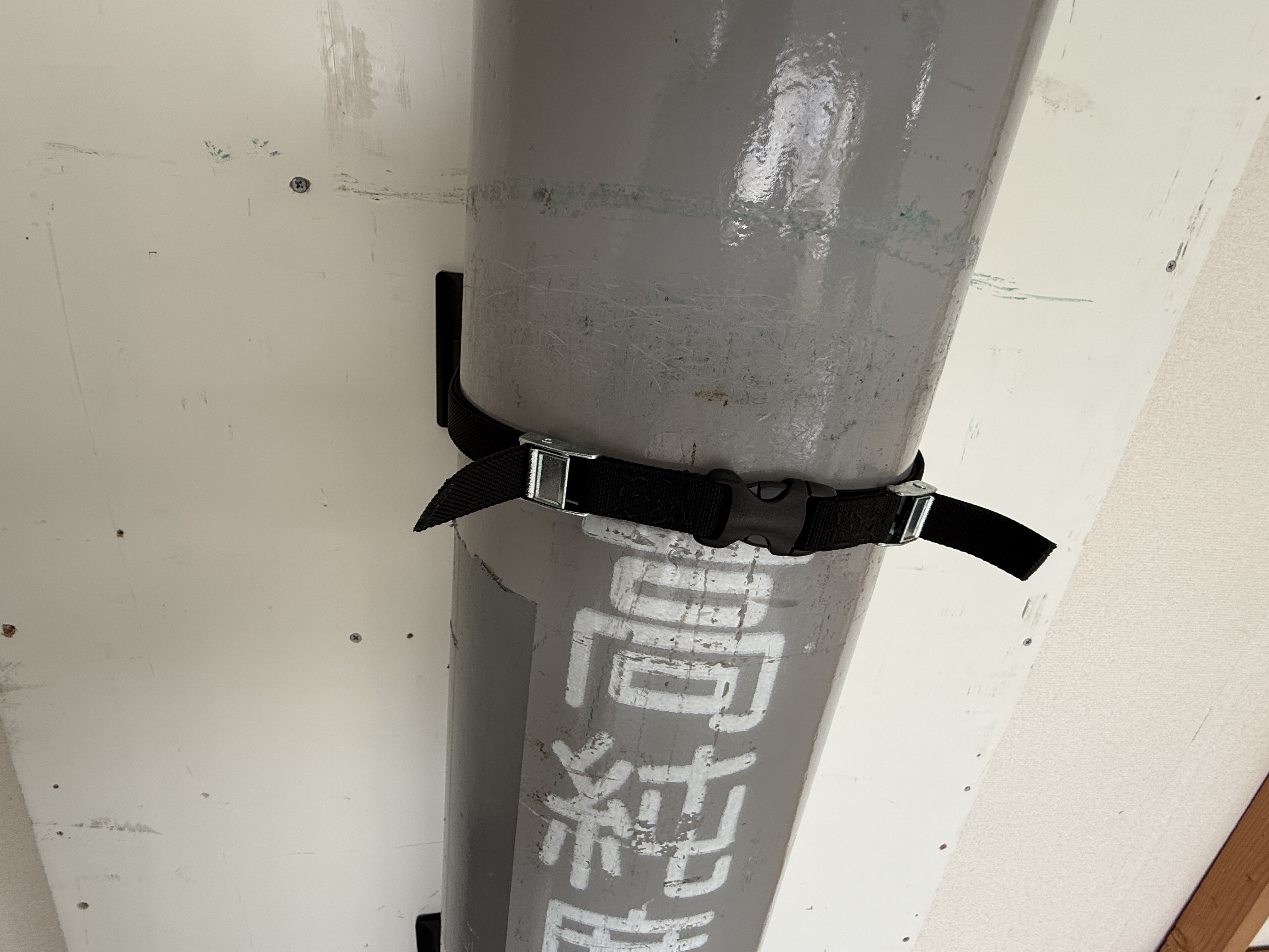 壁際に設置されたガスボンベを特性ベルトでしっかり固定し、転倒を防止します。